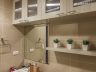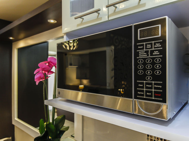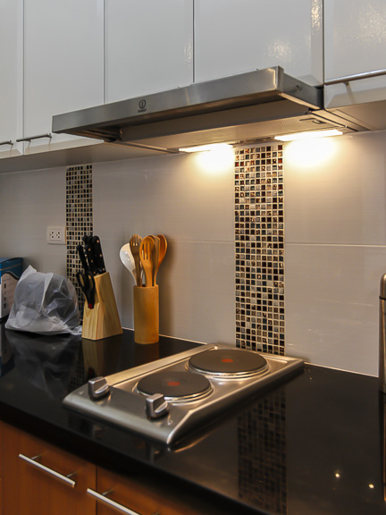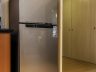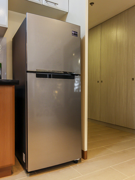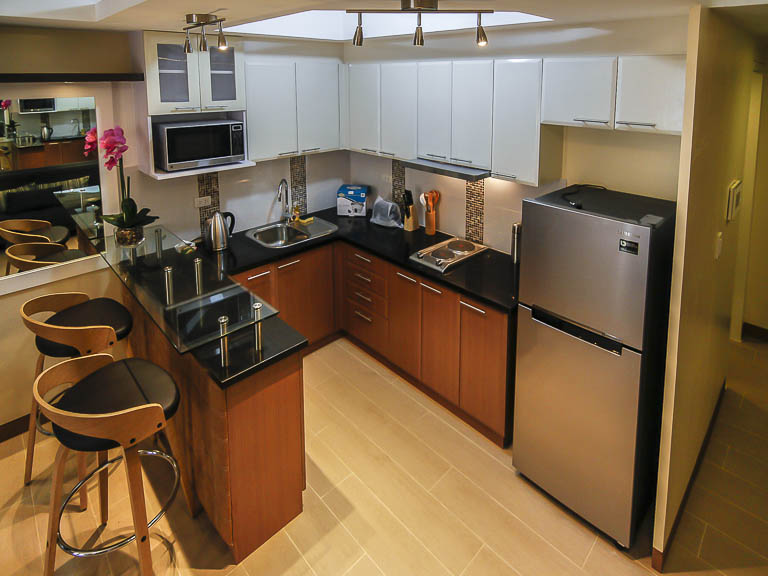 • The kitchen is laid-out in a corner with plenty of storage space, complete appliances, and a dining counter that saves space
