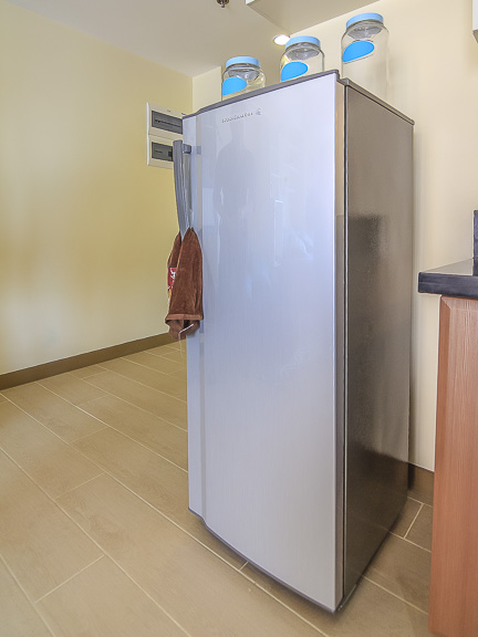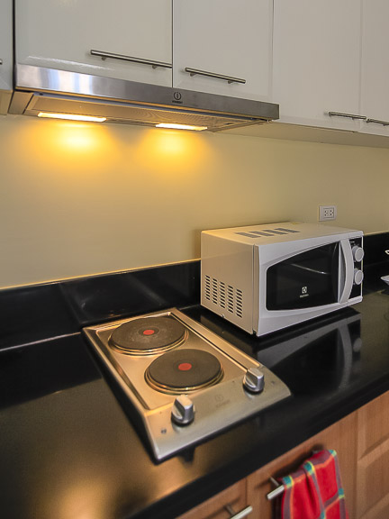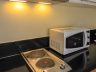 - Corner kitchen with the essential cooktop, fridge, microwave and rangehood