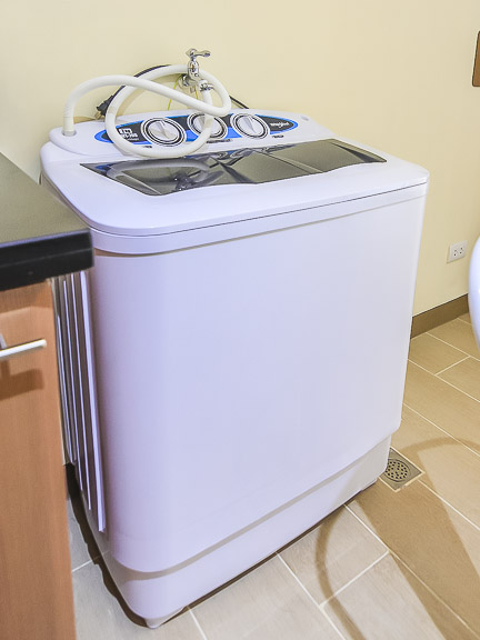 - On the side is a designed shelf and washing machine