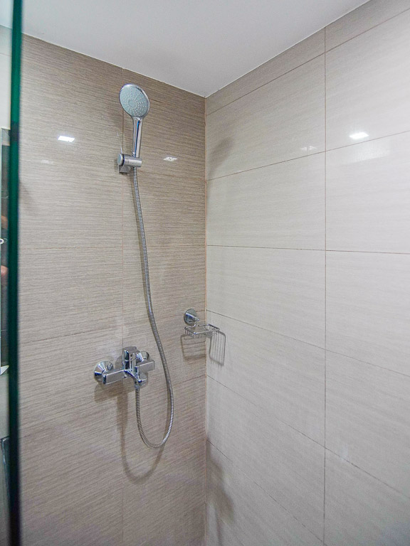 • Cream ceramic tile finish, wood flooring in the bedroom