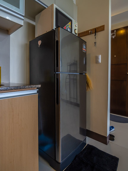- The kitchen is equipped with a two-door ref, microwave, and electric cooktop with range hood