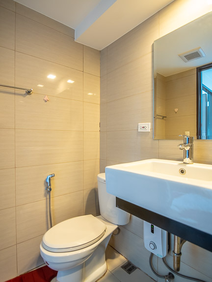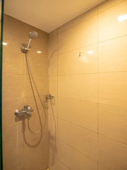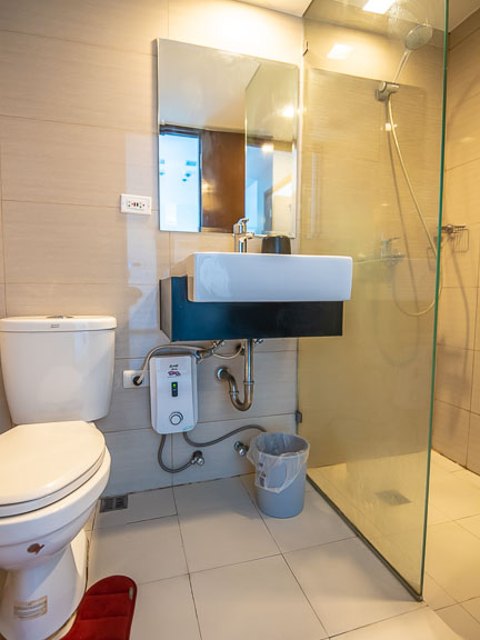 - The bathroom has a water heater, hand bidet, and large handheld shower