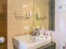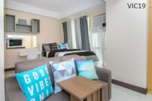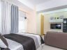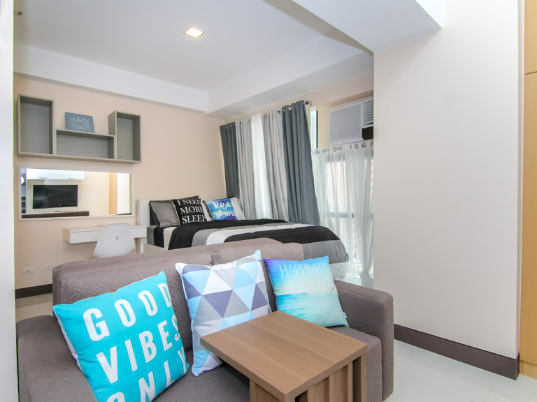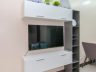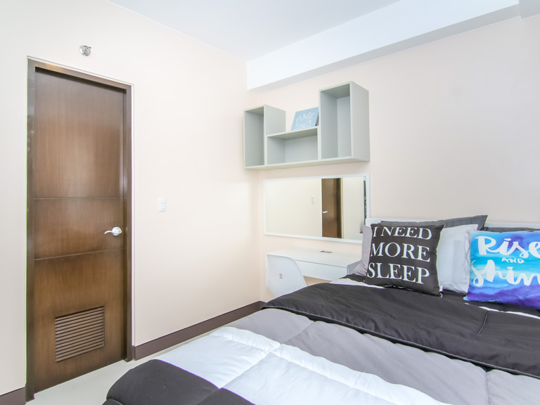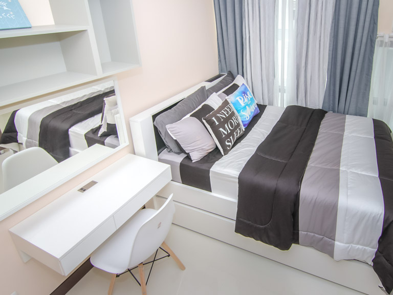 - A study desk with mirror, chair and cabinet storage sits next to the bed