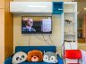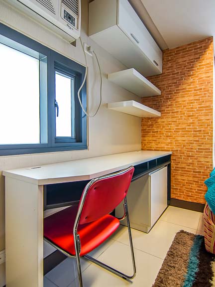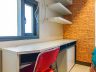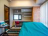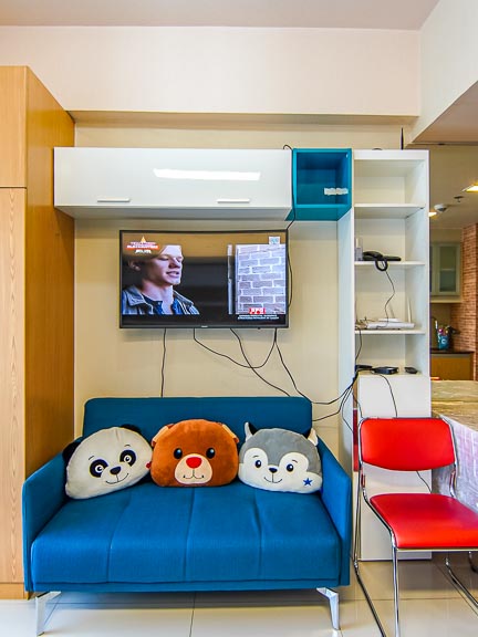 • Queen size platform bed, blue armless sofa, floating study desk, and two-seater dining set