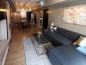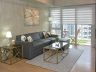 - Large slate grey sectional couch, matching side and center tables, carpet in the living area