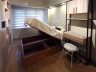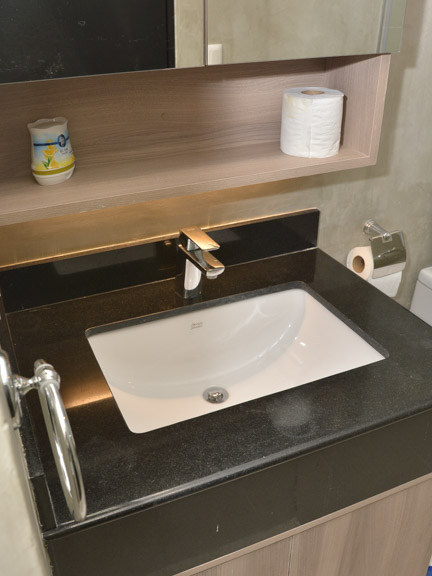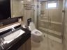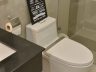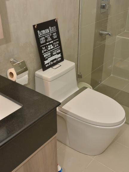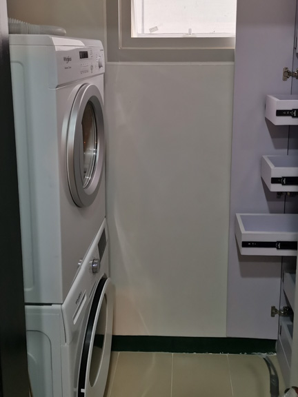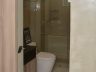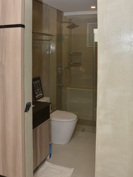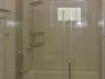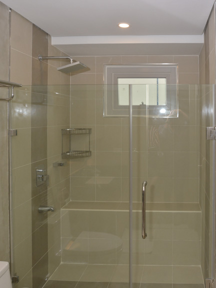 - Bathroom door replaced with custom sliding door, and is fitted with glass enclosure, and shower area with seat