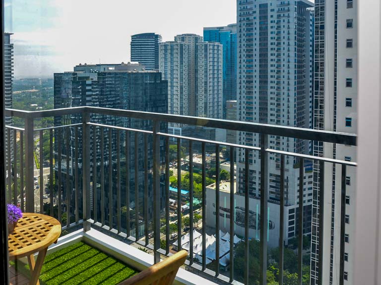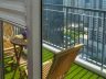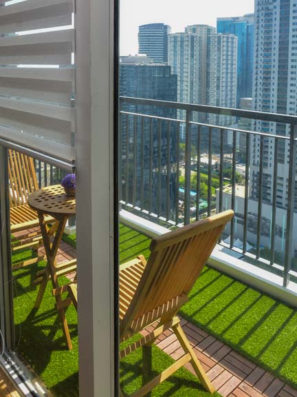 - Located on a high level with balcony containing folding outdoor table and chairs and artificial turf