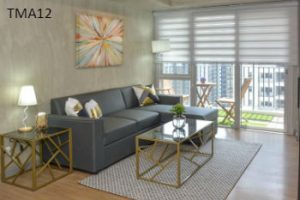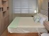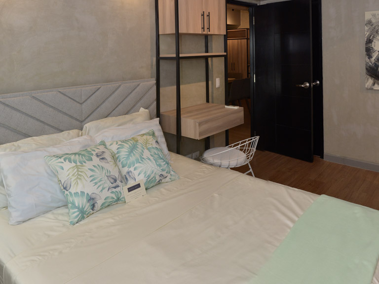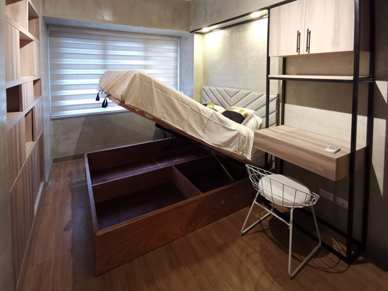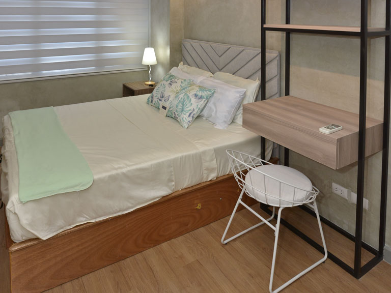 - The bedroom contains a queen size storage bed with upholstered headboard, study desk and side table with shaded lamp