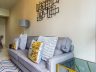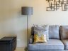 • Living area features a gray couch, shaded floor lamp, ottoman with storage, and large LED Smart TV
