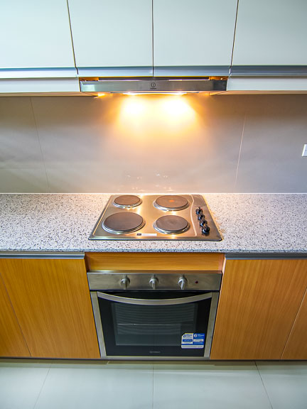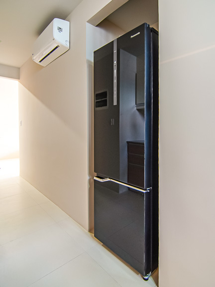 • Big kitchen near front door, equipped with two-door refrigerator, four-hob electric cooktop with range hood