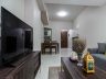 The living/dining room houses a linen sofa, high-back accent chair, coffee table, large LED TV, and four-seater dining table