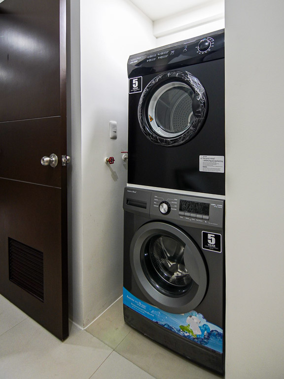 The maid’s room and laundry room are both located by the kitchen, where a front load washing machine and dryer are housed
