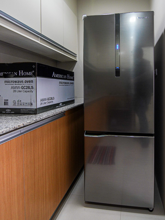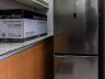 The kitchen is equipped with a bottom-freezer, 2-door fridge, slide-in oven, electric cooktop, range hood, and hot-and-cold water dispenser