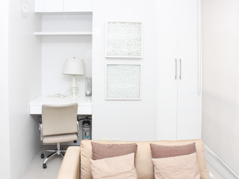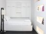 - Just outside the bedroom is a cozy elevated space with a twin-size platform bed against the wall. Above the bed are built-in cabinets, high cabinets and shelf cabinets