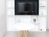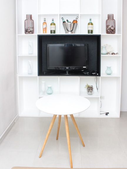 - Across the sofa is a wall rack-organizer with space provision for the flat screen TV