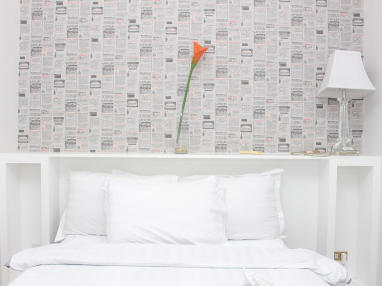 - Dominating the bedroom is a queen-sized bed against an accent headboard wall with a ledge