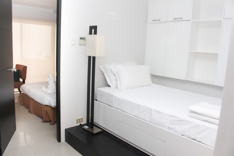 - Across the bed is a built-in cabinet