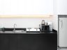 - The single-walled kitchen is with a black granite countertop and black-painted base cabinets. White wall-mounted cupboards above the counter provide additional storage