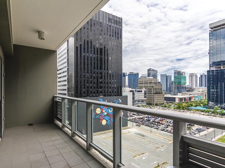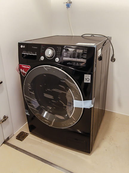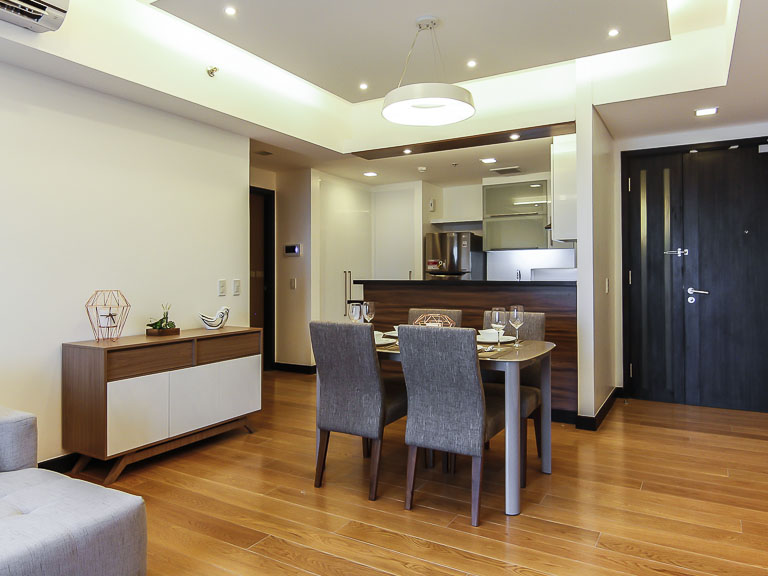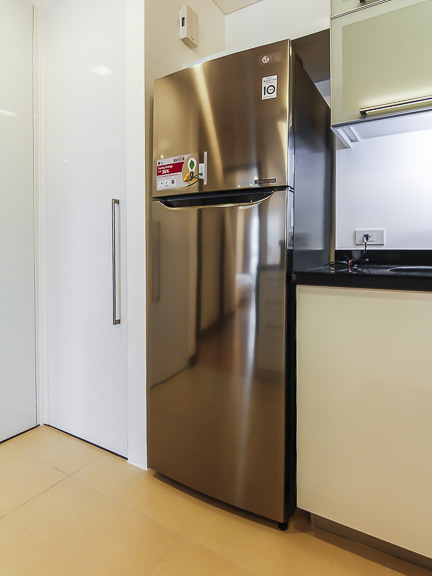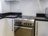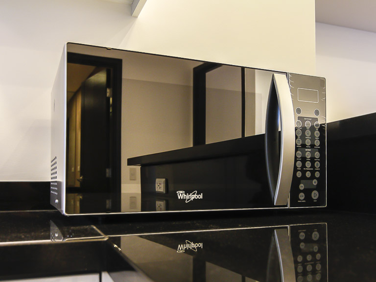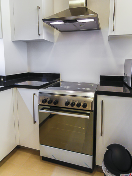 • Spacious kitchen with two-door fridge, electric range with hood, microwave oven and bar counter