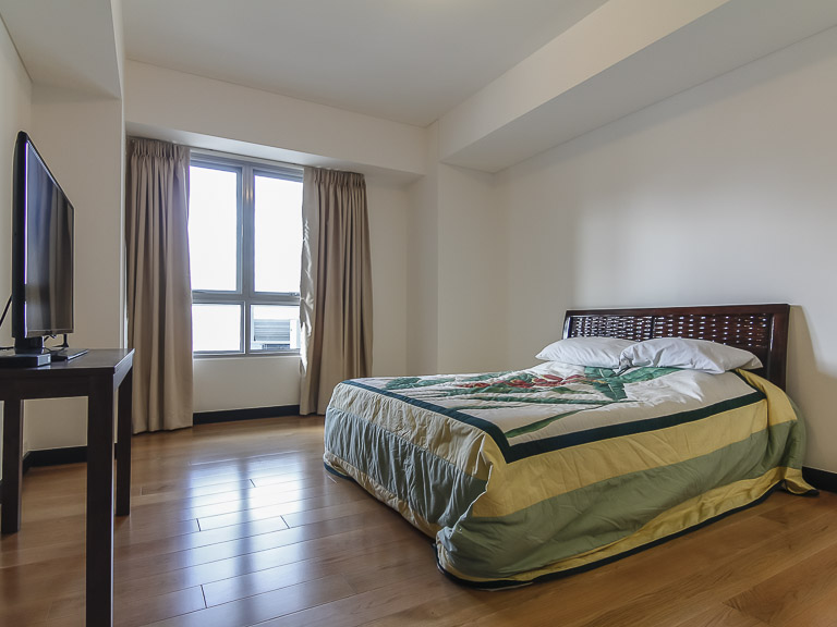 - Queen sized bed with pillows, linens and comforter, and flat-screen TV in bedroom