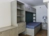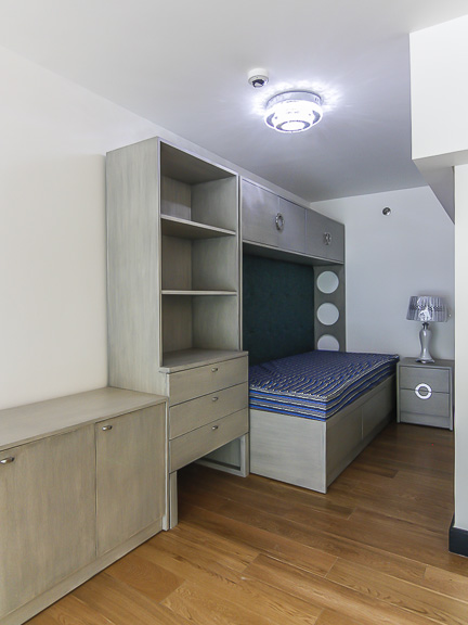 - Single storage bed with shelves, study desk and sofa on upper level bedroom/den
